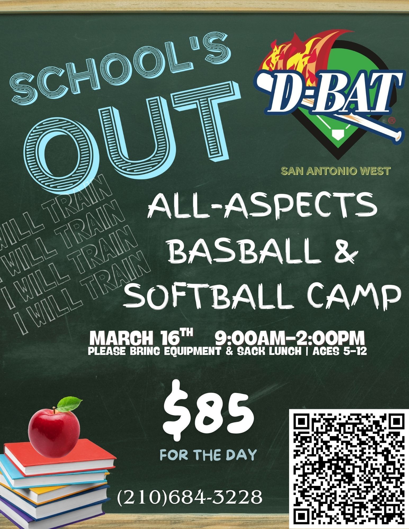 At D-BAT San Antonio, our Camps and Clinics provide a great opportunity for players to improve as players while having fun at the same time. Our Spring Break and Summer Camps are very popular with parents who are looking for something constructive to keep their ballplayers busy when school is out. Our Bat Speed Clinic, which is conducted during the winter, is considered by many players to be the best camp they have ever attended. D-BAT San Antonio also offers College camps and clinics that are led by some of the top coaches from some of the top college programs in the country such as University of Texas, Baylor University, and others. For the latest information on our camps and clinics, please click on the camp fliers below and you will be able to read all the details. If you would like to register for one of our Camps or Clinics, please click here or call 210.684.3228.